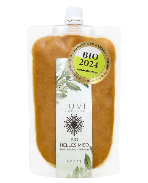 Luvi Fermente aus Regau am Traunsee in Oberösterreich ist auf biologische, handwerklich produzierte Fermente spezialisiert. Für das helle Miso werden österreichische Bio-Sojabohnen mit Bio-Reis aus Italien kombiniert.