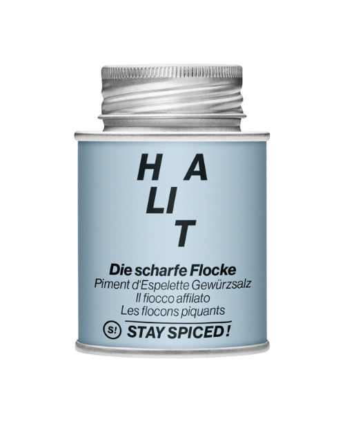 Stay Spiced mit Sitz in Salzburg bietet hochwertige Gewürz- und Salzkompositionen. Für Halit – Piment d’Espelette wird naturreines Steinsalz mit der A.O.C.-geschützten Chili-Sorte aus Espelette im französischen Baskenland kombiniert.